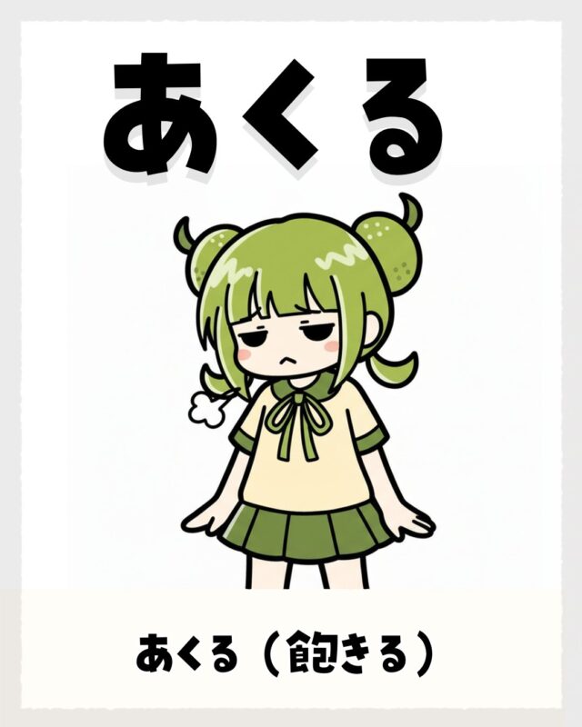 例は「その話、もうあくる(もう飽きた)」「毎日同じ弁当で、あくるわ〜」「ゲームあくっちしもうた」みたいに、気持ちが冷めた時にサラッと出る。地域差は大きくは見えにくいけど、「開ける」の「あくる」と同音やけん、県内でもイントネーションと文脈で判別する文化が前提になっちょる感じ。