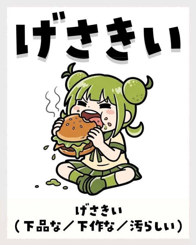 意味の中心は「食べ方がげさきい」「服がげさきい」のような“見た目やふるまいの品のなさ”やけど、日田の声みたいに「ずるいことをする」「汚いことをする」方向へ少し広がることもある。
