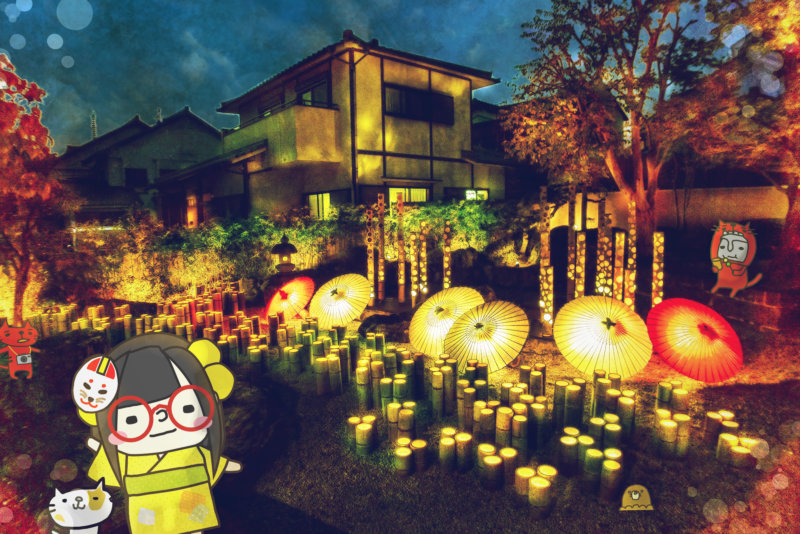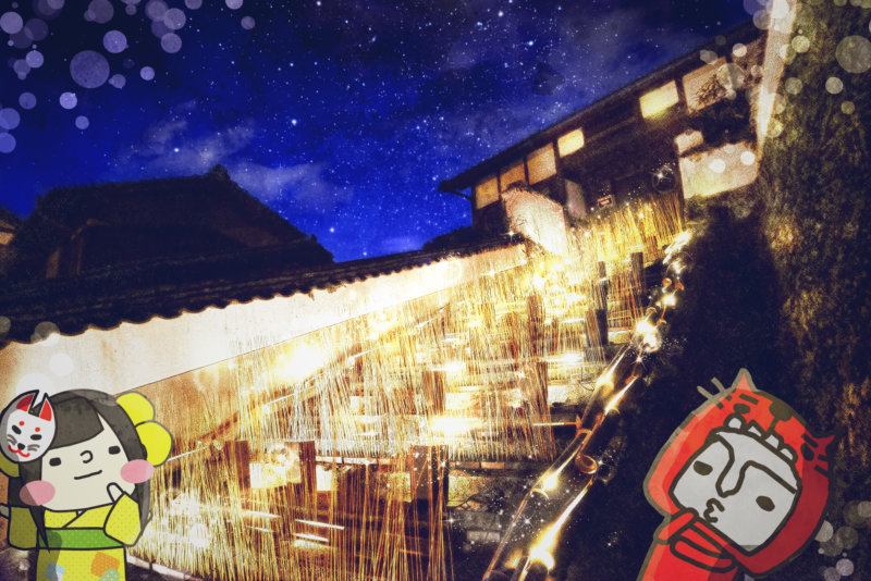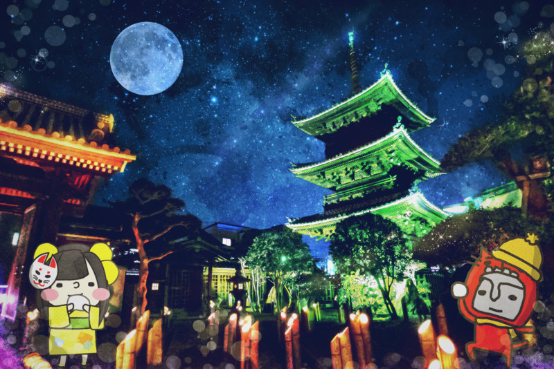 龍源寺の三重塔のライトアップと竹ぼんぼりのコラボは妖しくキレイ。