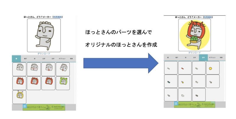 「ほっとさん、どう?メーカー」は、パーツを組み合わせて臼杵市のゆるきゃら「ほっとさん」を作るWebアプリです。パーツを組み合わせて自由に「ほっとさん」を作成し、ダウンロード(もしくは表示された画像の長押し)で画像を保存することができます。