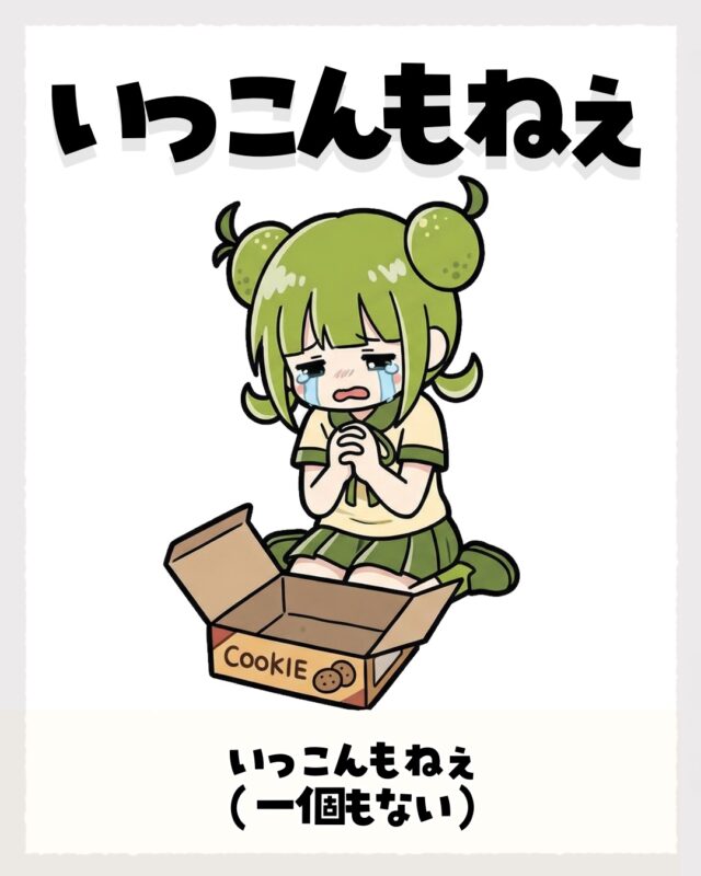県内の地域差としては、日田は「いっこもねぇ」寄りという声があり、ほかにも「いっこんねぇ」「いっちょもねぇ」「ひとっつもねぇ」など、数え方の部分が地域や家で揺れるみたい。意味は同じでも、「いっこんもねえ」は“個数”を意識した言い方やけん、お菓子・品物・残り物みたいに目に見える物によう合う印象やね。