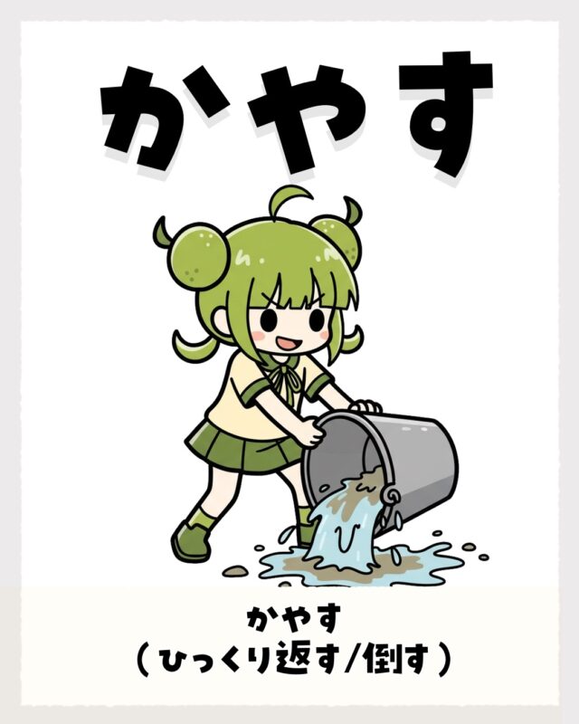 大分弁の「かやす」は「ひっくり返す/倒す」の“やった側”の言い方で、誰かの動作や不注意で物を倒した時に使うっちゃ。