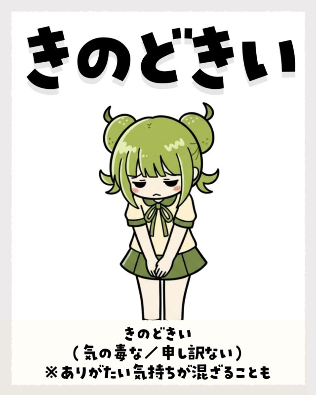 地域のゆれは語尾で「きのどきぃ/きのどきい」「きのどきがっち(=気の毒がって=遠慮して)」などが見られる。豆知識:奢りや手伝いへの「きのどきぃ〜」は、“次は私が返す”まで含んだ社交の合図っちゃ。