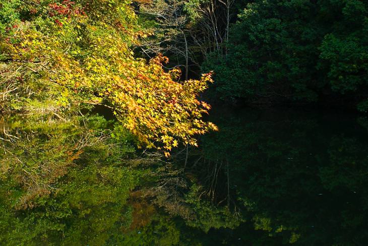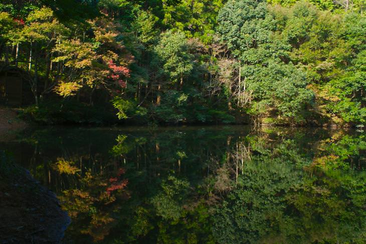 池に写るシンメトリーな構図もカッコいいです。もうちょっと赤くなるといいなー、