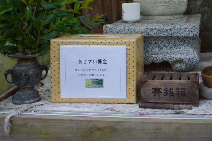 「あじさい募金」もありお賽銭とあわせていれ、手を合わせました。これだけキレイだと募金しようという気になりますね。