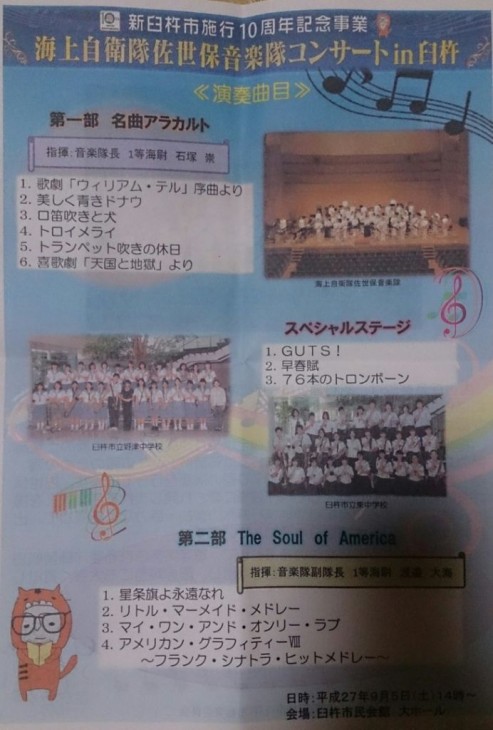 臼杵市ではめずらしいコンサートでしたが、海上自衛隊「佐世保音楽隊」の演奏はやっぱりすごく楽しめるないようでした。今回は臼杵市施行10周年記念でおこなわれたので無料だったのですが、これは「無料じゃなくても行っていいな」と思わせる内容だと思いました。市民会館も使わないともったいなので、良い事例ができたんじゃないかなーっと思ったりします。