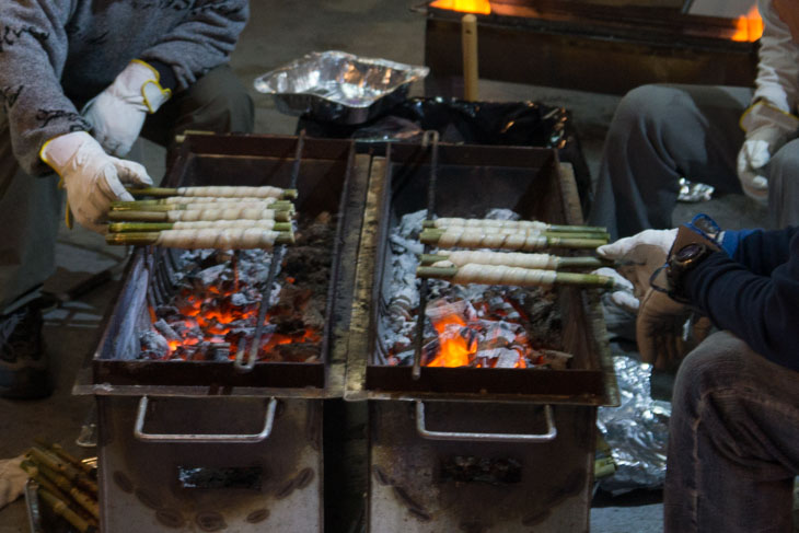 「たち巻き」は竹の棒に、臼杵の特産魚「太刀魚」の身をぐるぐる巻きにして、味をつけて焼いた食べ物です。一本一本丁寧にその場で焼いてますね。