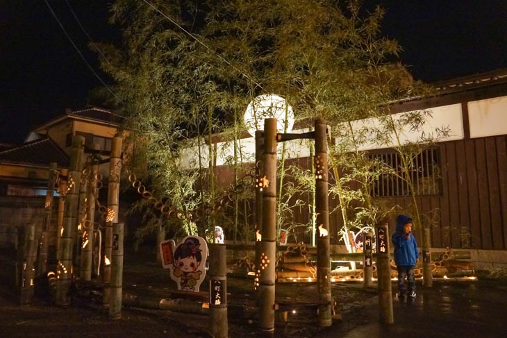 八町大路の「お八栄ちゃん」が一同に一箇所に集まって、竹オブジェと一緒に臼杵の夜を彩っていました。…お、お八栄ちゃんが…いっぱい。