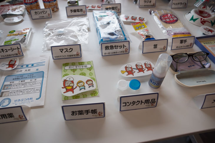 今回の本題は、施設の話ではないのでおいときますが、この場所に沢山の防災グッズが展示されていました。でも…よくみると、…よくみると臼杵のゆるキャラ「ほっとさん」があちらこちらに。…おいおい。