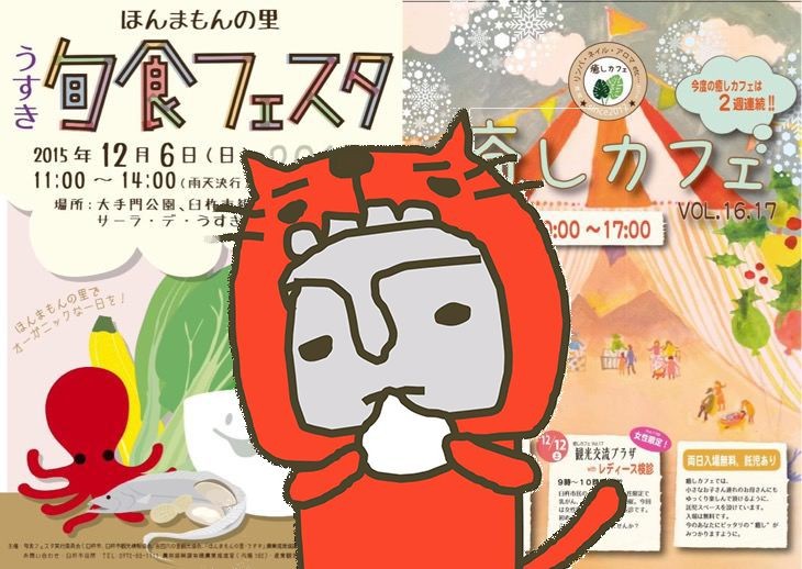 ※例えば「旬食フェスタ」&「癒しカフェ」の時の記事の見出し。こんな感じで「ほっとさん」イラストを挿入しています。