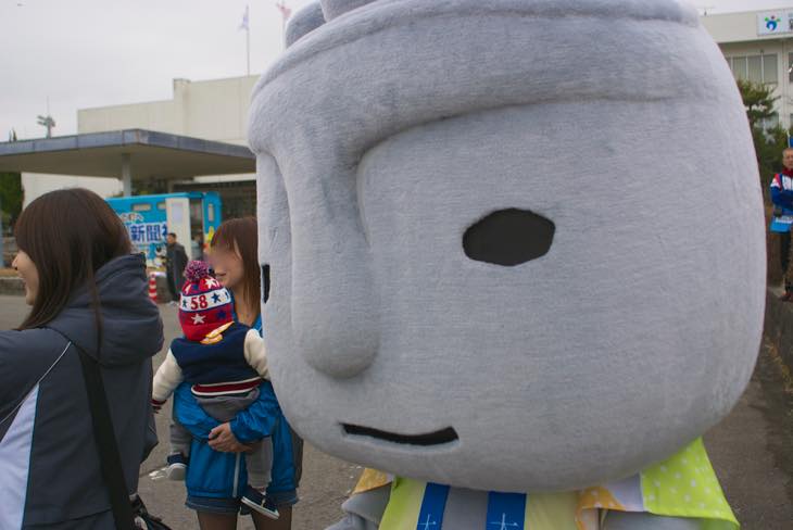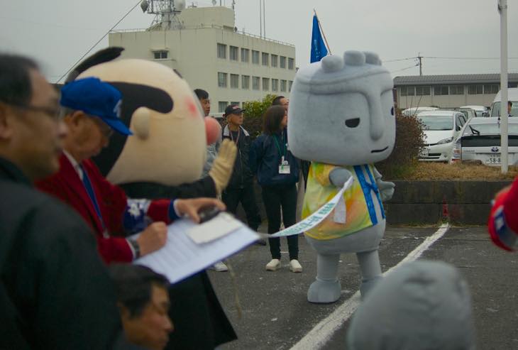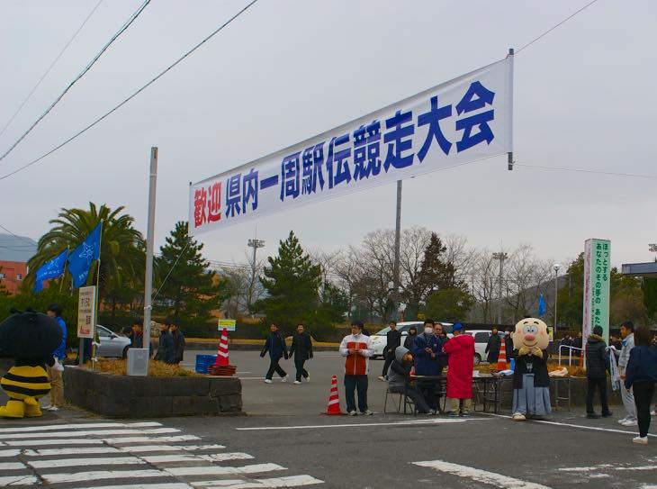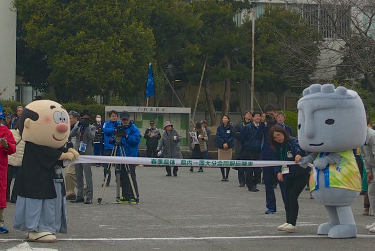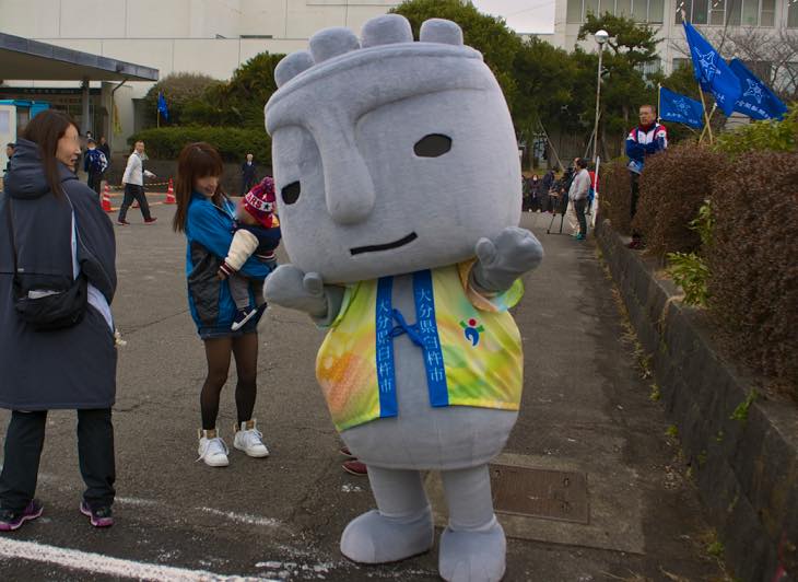 ということで、この時点では臼杵市は3位でした。まだまだ先が長いので、しっかり応援していきましょう!で、えんどうさんちは今回は駅伝の舞台裏からお届けしました。しっかり、ほっとさん、吉四六さん、ぶんぶんの「ゆるキャラ」夢の共演写真をとらせていただきました。