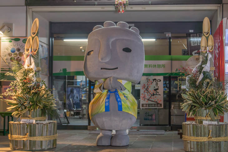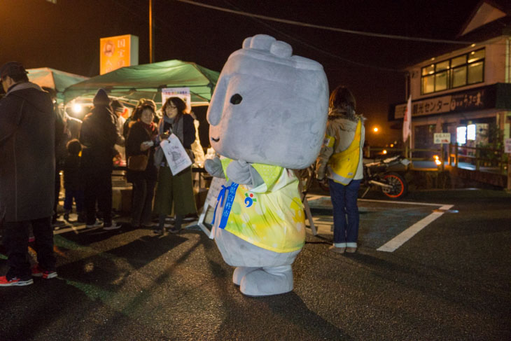 また、この日は、臼杵石仏の参道には松明で照らされ、火まつりを含む、年に2回しかない景色を見ることができました。残念ながら今年は、大日如来を含む古園石仏はみることはできませんでしたが・・・かわりに?臼杵市の観光PRキャラクター「ほっとさん」が来ていました。