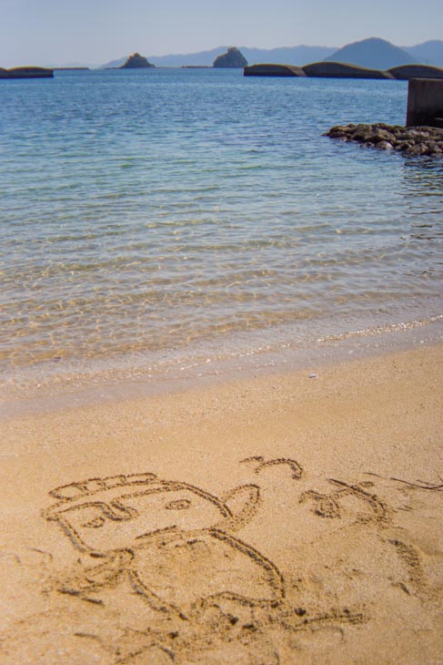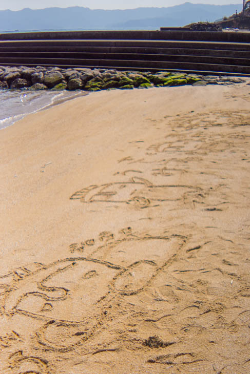 ここの砂浜に「ほっとさん」をいっぱい描いていました。