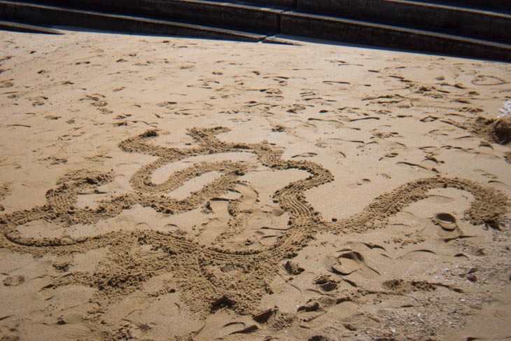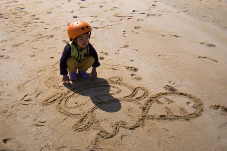 海の近くに来たからといって別に海に入れるわけではないので、何をしようかなぁと大人も考えます。ということで砂浜に絵を描いてみました。