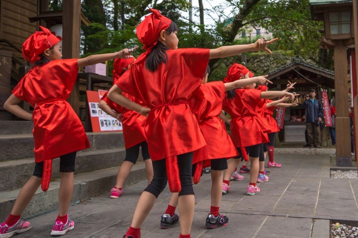 臼杵の子どもたちが、あかねこの赤い衣装に、ネコ耳のある衣装をつけて、元気に踊る姿は、そこら辺のコスプレ娘になんかひけをとりません。