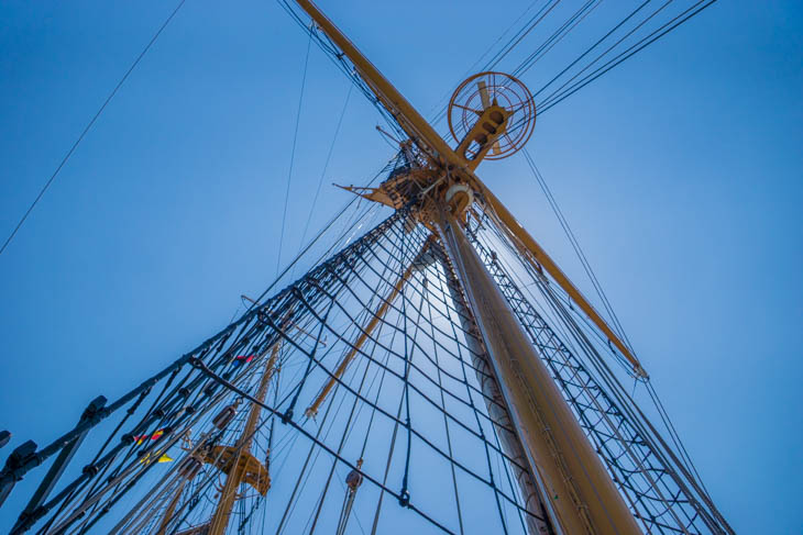 帆を張るためのマストは「ぐぐっと」天をついていて、まわりのロープがある意味デザインみたいできれいでした。