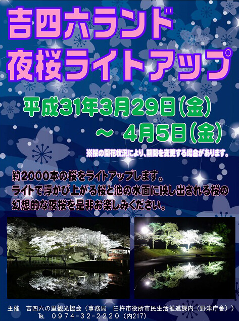 概要 吉四六ランドの池の周りの斜面に咲き誇る2,000本の桜をライトアップします。