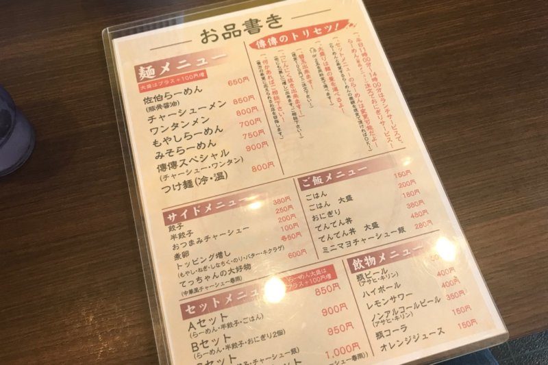 佐伯ラーメン傳傳(でんでん)大分臼杵店のメニュー
