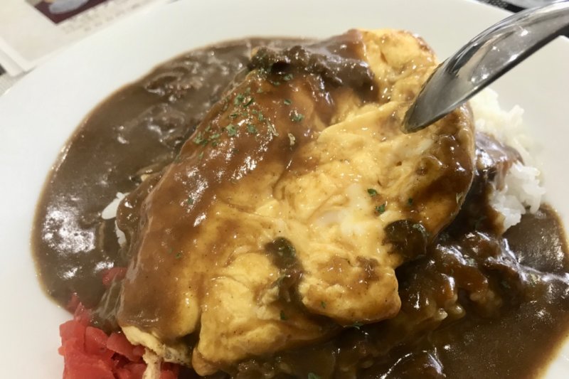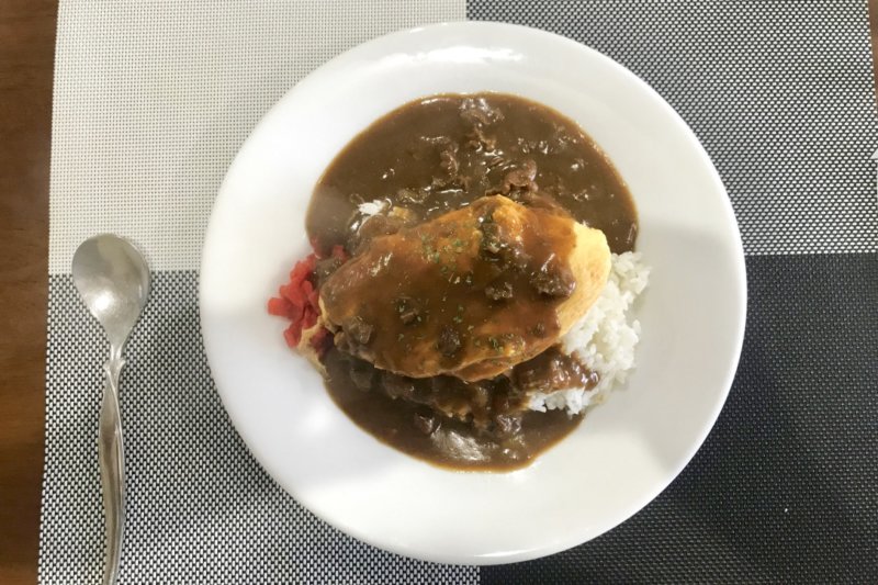 その日によってお魚のフライにみそ汁・ごはんが付く場合もあるそうです。で、この日は「オムカレー」でした。