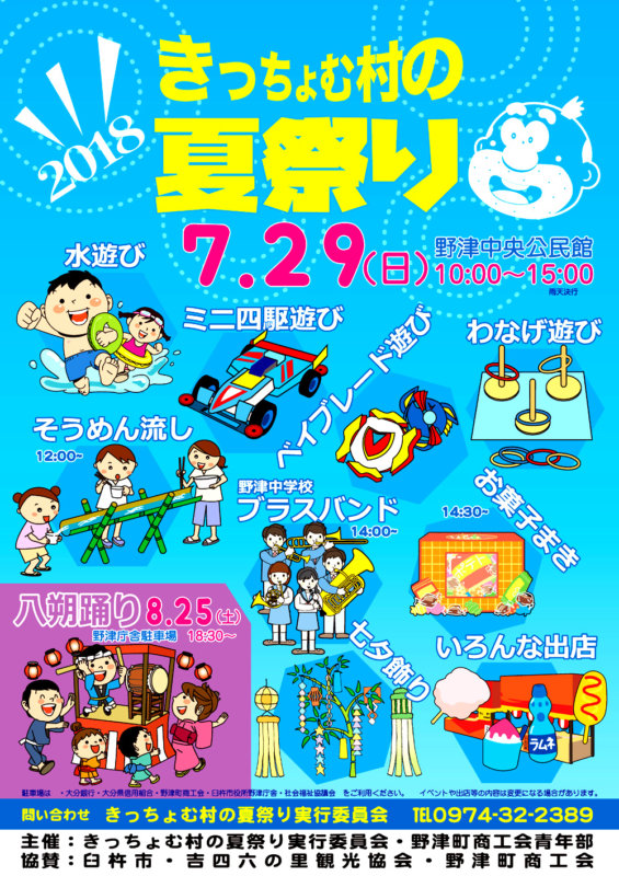 きっちょむ村の夏まつり【7月下旬】 きっちょむ村の夏まつり 毎年7月下旬「きっちょむ村の夏まつり」が野津中央公民館にて開催されます。 ※そうめん流しなどのいろいろな楽しい催しや出店があります。 ※雨天決行 今年の「きっちょむ村の夏まつり」についての情報は「うすきイベント!」を御覧ください。 [blogcard url=”https://usuki.xyz/kicchomu-summer/”]