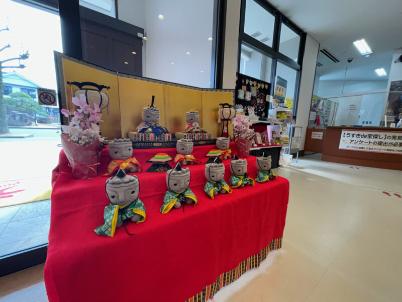 「うすき雛めぐり」の時期、臼杵市観光交流プラザの入り口に、「うすき紙雛」とは違うひな壇が飾っています。