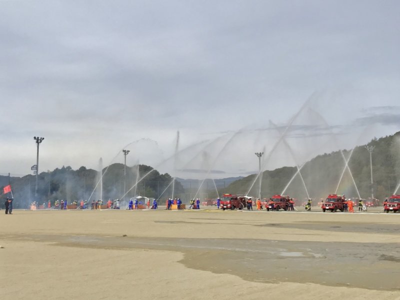 今回は、消防団の行進に、各分団の放水車17台も一緒に行進していました。