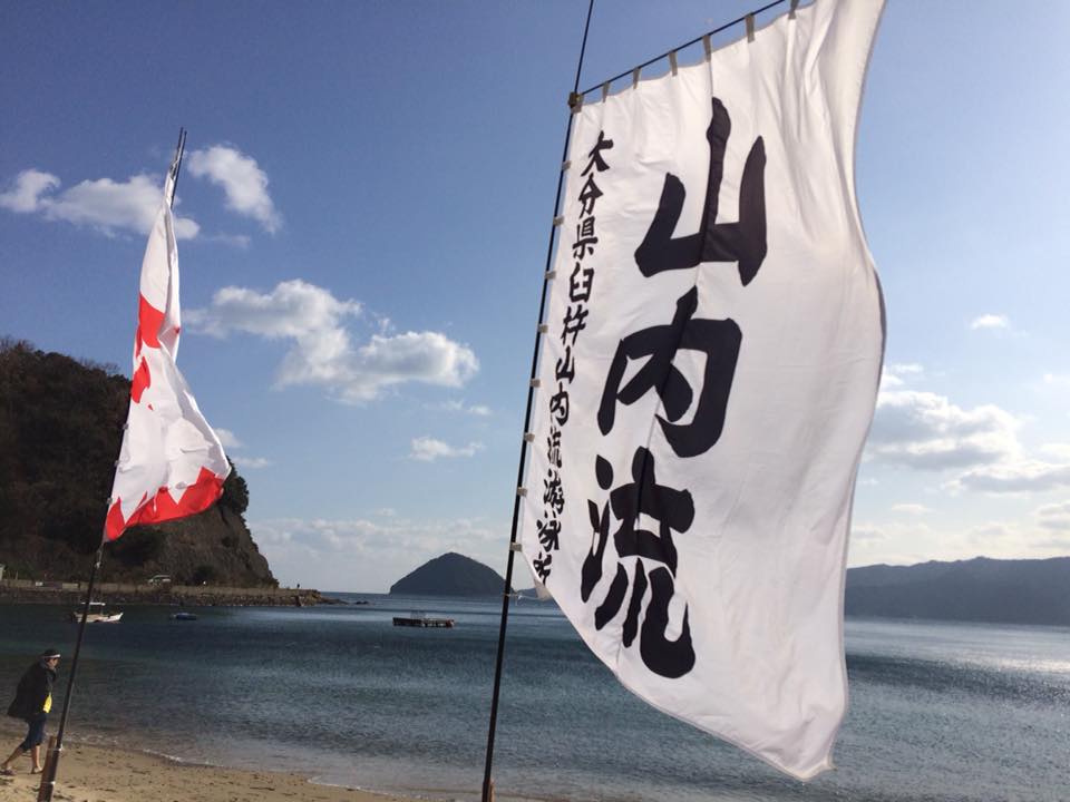 夏休みになると、中津浦を海辺を利用して臼杵山内流(古式泳法)を教えてくれる教室が開催されます。