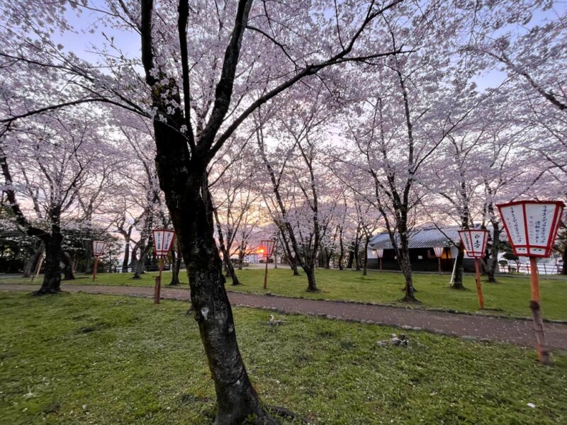 朝日がのぼり、少しずつ照らされる桜や城内の空間は、
