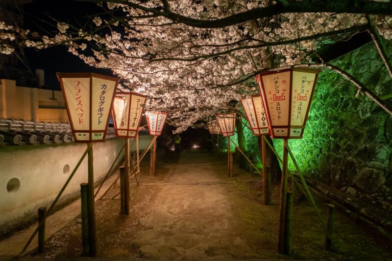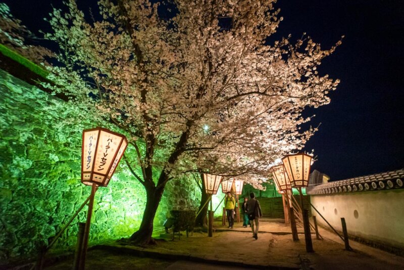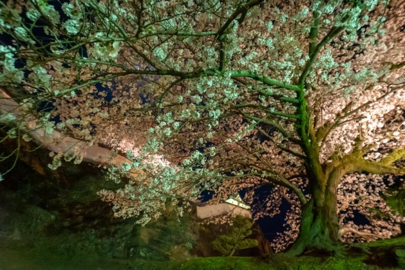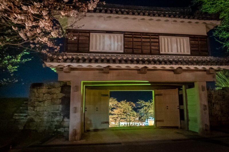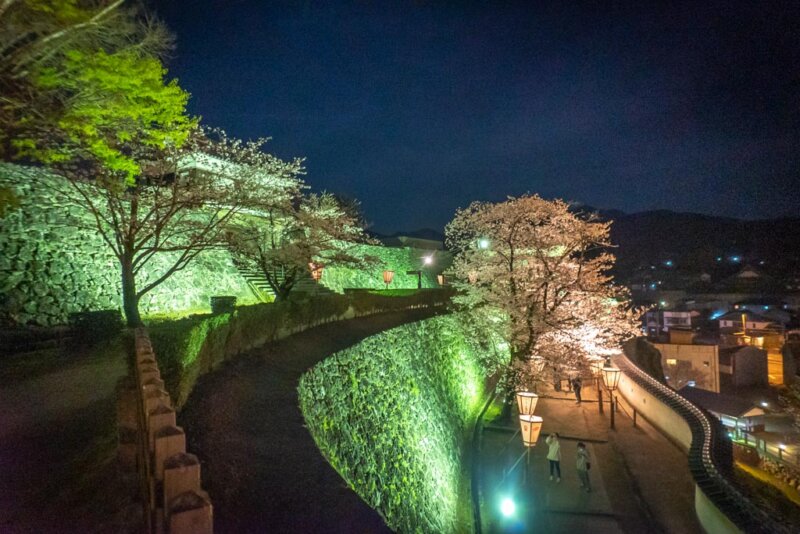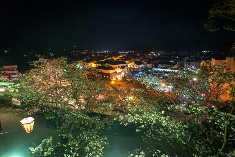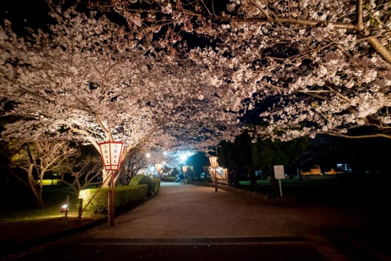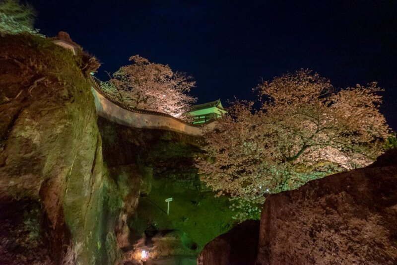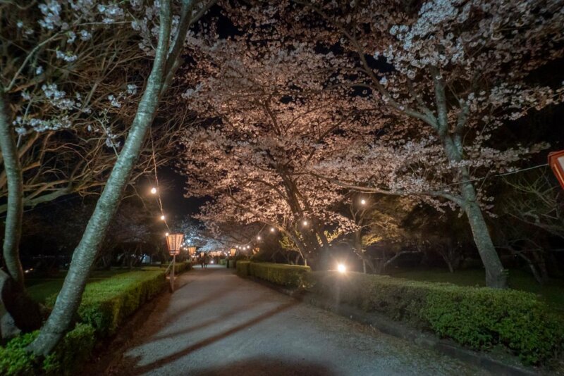 大分県臼杵市の臼杵城址には800本もの桜があり、「臼杵城址桜まつり」の期間中、城内の桜とお城がライトアップされます。